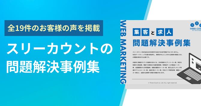 ーこの資料では、スリーカウントの「集客」「求人」に関する問題解決事例をまとめています。 様々な業種や問題に向き合って解決してきた事例を全19...資料ダウンロード