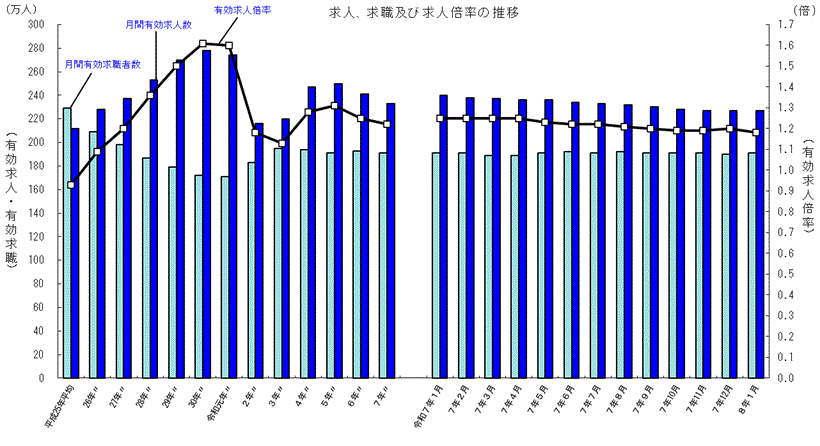 厚生労働省の調べによると、2026年1月の全国平均(季節調整値)は1.18倍で、依然として求職者1人に対し1件以上の求人がある売り手市場です。前月より0.02ポイント低下したものの、高止まりの状況が続いています。