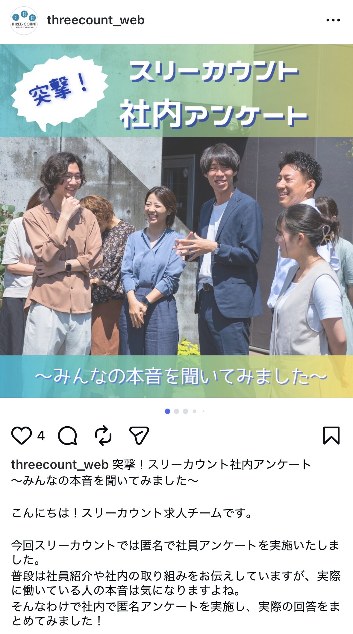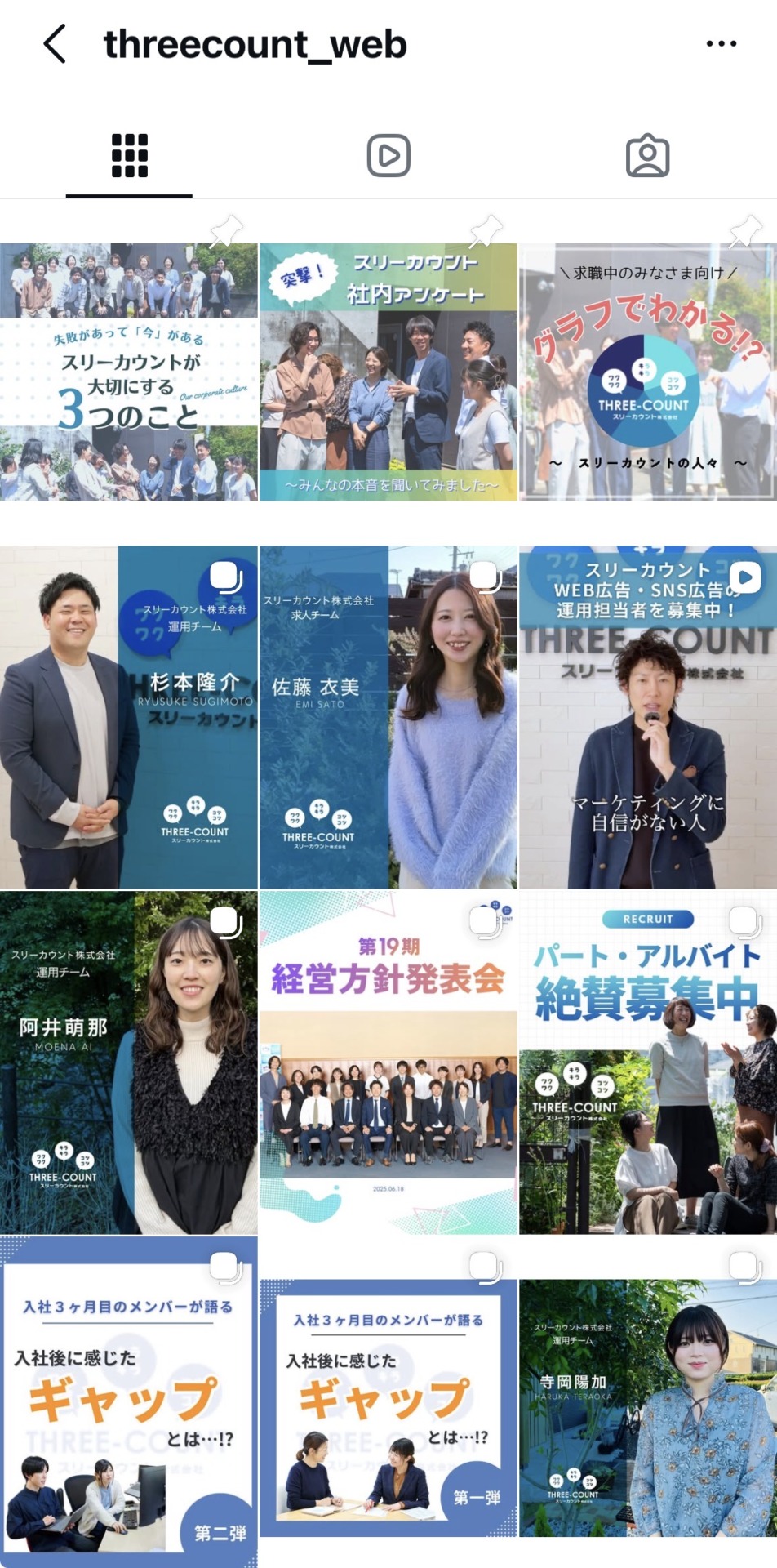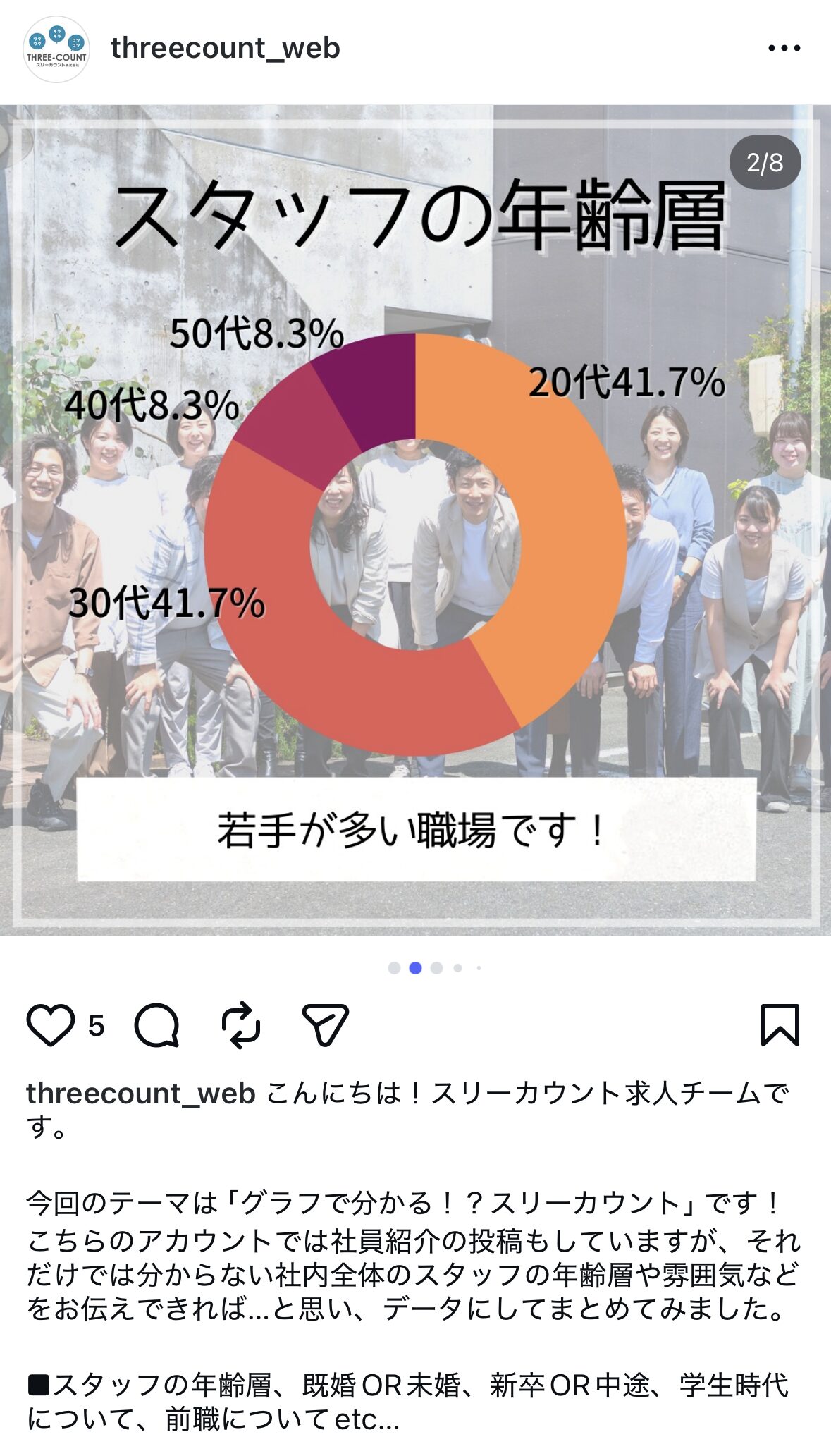 改めて、少しだけ私たち自身の話をさせてください。スリーカウント株式会社は、WEBマーケティングを専門とする会社です。ここ数年、自社の採用活動においてもインスタグラムを活用し、継続的に応募を獲得してきました。直近の実績でいうと、