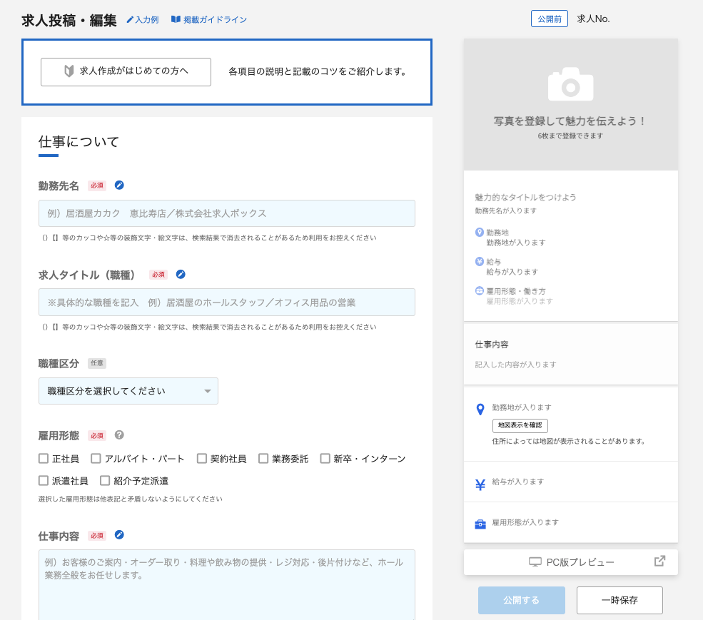 アカウントが作成できたら、管理画面から求人票を作成していきます。公式サイトでは「ブログを書くような簡単操作で求人投稿ができる」と案内されており、必須項目だけであれば5分程度で入力できます。