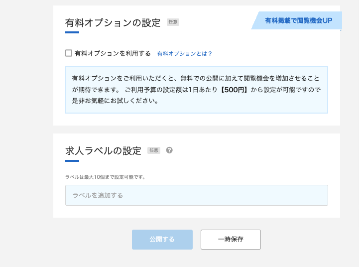 求人票の作成画面の下部に「有料オプションの設定」というセクションがあり、「有料オプションを利用する」にチェックを入れるだけで有料掲載に切り替えることができます。クレジットカードの登録と1日あたりの予算設定を行えば、すぐに配信が始まります。