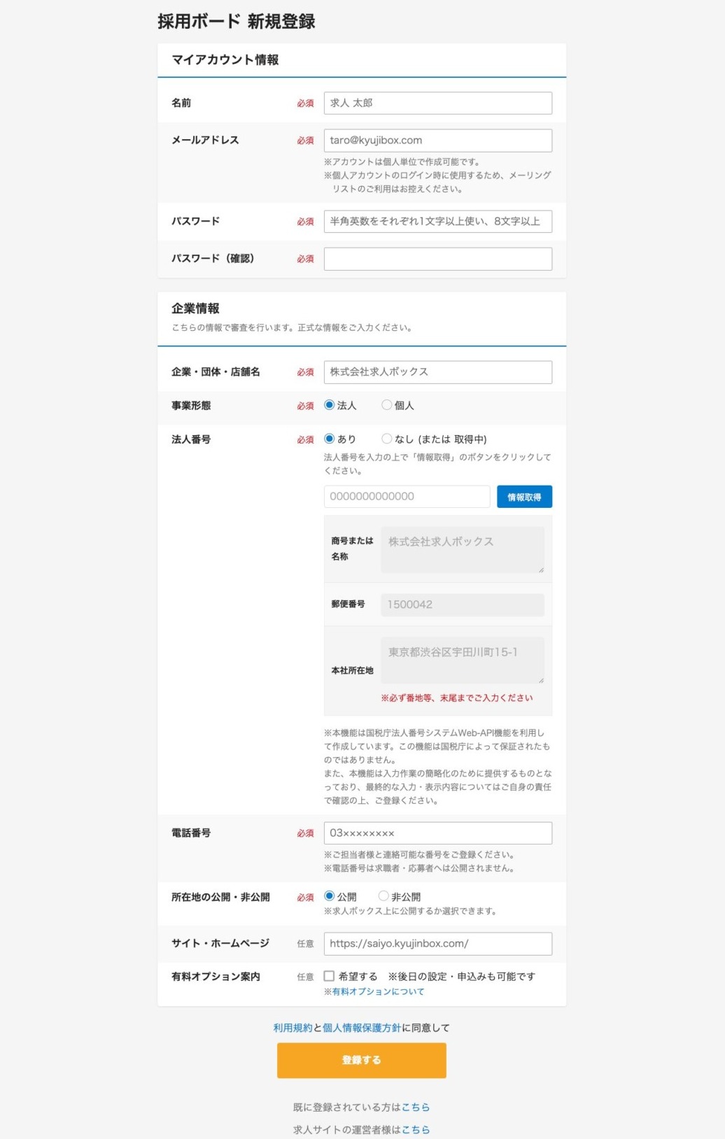 まずは求人ボックスの採用ボード新規登録ページにアクセスし、アカウントを作成します。登録画面は「マイアカウント情報」と「企業情報」の2つのセクションに分かれていて、入力する項目は以下のとおりです。