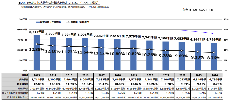 この数値は2013年以降、減少はしているものの緩やかな状況が続いており、世帯あたりの平均飼育頭数については増加傾向にあります。この数は0~5歳の未就学児の数(510万人)よりも多く、非常に大きな市場であることがわかります。