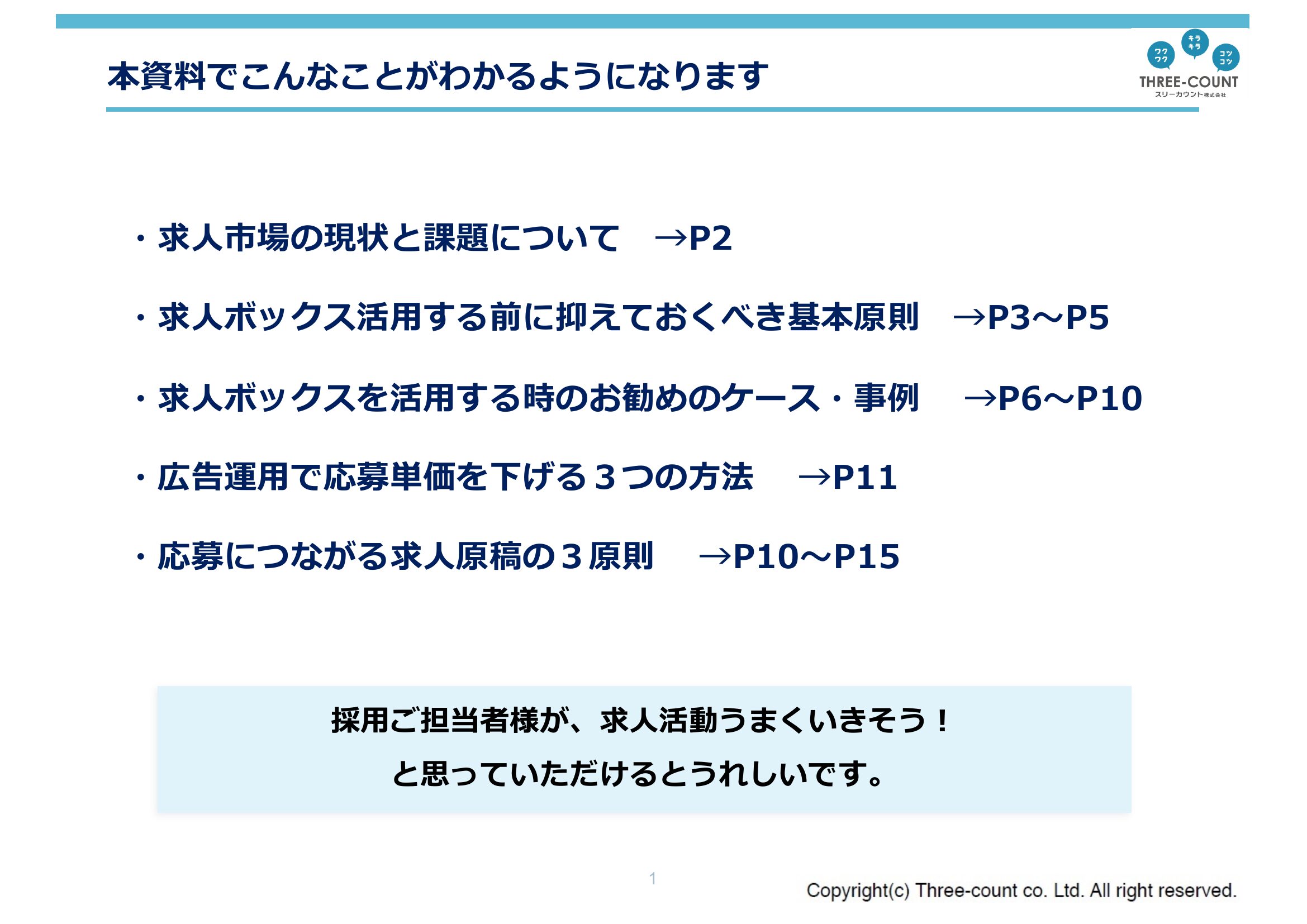 この資料では、求人ボックスの活用を検討している採用担当者様に向けて、媒体選択・広告運用・求人原稿の3つの観点から実践的なノウハウを整理しています。Indeedのクリック単価が高騰する中で、求人ボックスをどう組み合わせれば採用コストを抑えながら応募数を増やせるのかを、事例やデータを交えながら解説しています。